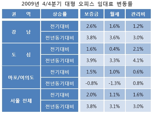 대형 오피스의 공실률이 하락하면서 임대료도 상승세로 전환됐다. 지난해 4/4분기 서울 대형오피스빌딩의 ㎡당 평균 임대료는 보증금 20만5700원, 월세 1만9500원, 관리비 8500원 수준으로 조사됐다. 이는 전분기 대비 보증금 2.0%, 월세 1.1%가 각각 상승한 것이다.