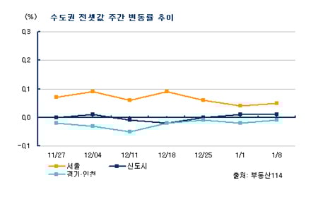 신도시에서는 중동(0.07%)과 일산(0.01%)의 상승세에 힘입어 전체적으로 0.01% 올랐다.