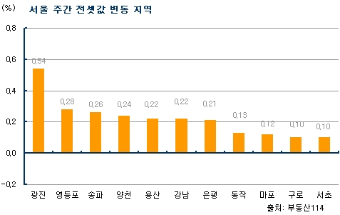 16일 부동산 114에 따르면 이번주(11~15일) 서울 아파트 전세가격은 전주대비 0.14% 상승했다. 구별로는 광진(0.54%) 영등포(0.28%) 송파(0.26%) 양천(0.24%) 강남(0.22%) 용산(0.22%) 은평구(0.21%) 등이 상승세를 보이는 등 전체 25개 구 중에서 19개 구가 상승률을 기록했다.