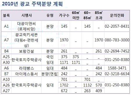 경기도시공사에 따르면 올해 광교신도시에서 9300여 가구가 분양된다. 이미 1월 한양수자인, 자앤앤자이가 분양을 끝냈고 A1블록에 로제비앙 145가구 60~85㎡가 청약접수를 받을 예정이다. 오는 4월에는 A7블록에 대림산업의 ‘e편한세상’ 1970가구가 청약접수를 받는다. 공급면적 82~145㎡로 구성된다. 이밖에 보람건설 261가구, 한국토지주택공사의 국민임대물량 등이 공급된다.