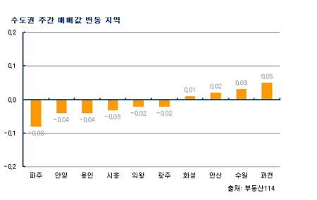 반면 과천(0.05%) 수원(0.03%) 안산(0.02%) 화성(0.01%)은 소폭 상승했다. 과천은 별양동 주공5단지, 부림동 주공9단지, 중앙동 주공10단지 등이 서울 강남권 재건축 상승의 영향으로 오름세를 나타냈다.