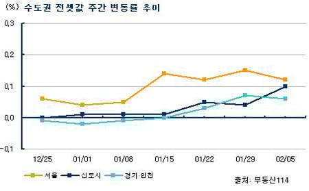 5일 부동산정보업체인 부동산114에 따르면 이번주(2월1~5일) 서울 아파트 전셋값은 평균 0.12% 상승했다. 외곽권의 상승폭이 덜하지만 25개 자치구 모두 상승률을 기록했다. 광진(0.33%) 송파(0.32%)가 큰 폭으로 상승한 가운데 서초(0.25%) 관악(0.18%) 성동(0.15%) 강동(0.14%) 동작(0.14%) 등도 오름세를 나타냈다.