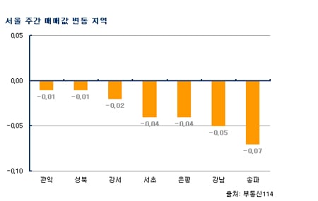 5일 부동산정보업체 부동산114에 따르면 이번 주(2~5일) 서울 재건축 매매가는 0.15% 내려 4주 연속 하락세를 이어갔다. 송파구가 0.36% 하락했고 강남구가 0.19%, 서초구가 0.13% 떨어졌다.