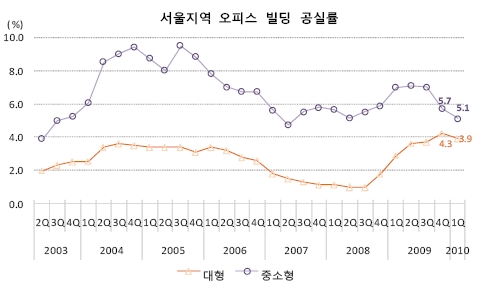 1일 알투코리아부동산투자자문에 따르면 올 1/4분기 서울 대형오피스 공실률은 3.9%로 전분기 대비 0.4%포인트 하락한 것으로 조사됐다. 중소형 오피스 공실률도 전분기보다 0.6%포인트 떨어진 5.1%를 기록해 공실률 상승세가 꺾이고 점차 회복국면에 접어든 것으로 분석됐다.