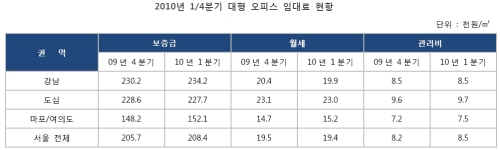 올 1/4분기 서울 대형오피스빌딩의 ㎡당 평균 임대료는 보증금 20만5700원, 월세 1만9500원, 관리비 8500원 수준으로 조사됐다. 권역별로 보면 강남권역은 보증금 23만4000원, 월세 1만9900원 수준이었고 도심권역은 보증금 22만8600원, 월세 2만3000원이었다. 마포·여의도권역은 보증금 15만2100원, 월세 1만5200원을 기록했다.