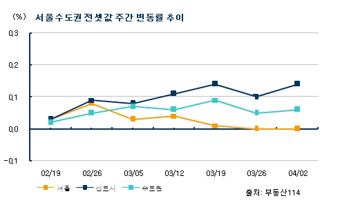 2일 부동산 정보업체 부동산114에 따르면 이번주(3월29일~4월2일) 서울 아파트 전세가격은 전주와 변동이 없는 것으로 나타났다. 반면 신도시는 0.14%, 경기·인천은 0.06% 올랐다. 서울에선 마포(0.11%) 강북(0.09%) 동작구(0.09%) 등이 올랐고 양천(-0.15%) 송파(-0.12%) 서초(-0.04%)는 하락했다.