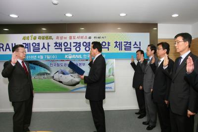허준영 코레일 사장은 7일 서울 사옥에서 코레일관광개발(대표 길기연), 코레일유통(대표 최창섭), 코레일로지스(대표 박선규), 코레일테크(대표 이달호), 코레일네트웍스(대표 이가연), 코레일공항철도(대표 하승열) 등 계열사 사장단과 책임경영 계약을 체결했다. 독자들의 PICK! 친구 아내와 바람난 남편...월 300만원 받고 방 잡아준 친구 제니, 50억 집도 사더니...용산 '200억' 건물 전액 현금 매입 배우 정은우, 돌연 사망 비보…하루 전엔 SNS에 장국영 사진 구준엽, 서희원 '400억 유산' 두고 장모와 갈등? 처제 입 열었다