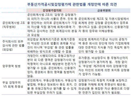 감정평가협회도 이 같은 해석은 감정평가사 고유의 업무영역 침범이라고 반박하고 있다. 협회는 "회계감사인이 회계수치를 직접 장성하는 것은 국내법 뿐 아니라 세계적으로도 금지된 원칙이고 분식회계를 조장할 수 있다"며 "금융위의 의견대로라면 회계사뿐만 아니라 공인중개사, 부동산중개회사, 부동산개발업체 등도 토지, 건물에 대한 평가를 할 수 있게 돼 전문성과 신뢰도가 떨어지게 된다"고 맞섰다.