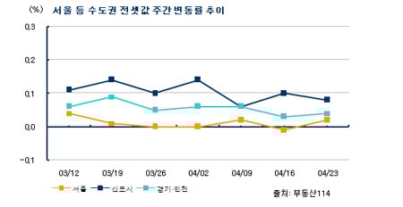 23일 부동산 정보업체 부동산114에 따르면 서울 아파트 전세가격은 전주대비 0.02% 상승했다. 지난주 서울 전세값은 1월 이후 첫 하락세를 보였었다.