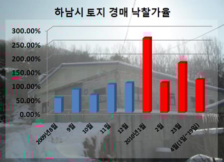 황무지, 산림 등 개발이 안된 임야도 마찬가지다. 지난 1월 하남시 초이동 임야 751㎡는 무려 65명이 입찰해 감정가 6008만원의 268.2%인 1억6111만원에 팔렸다.