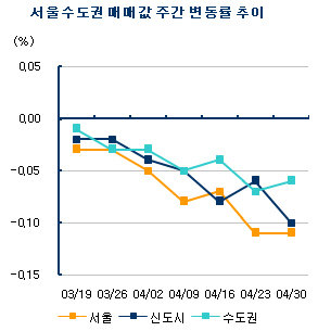 30일 부동산정보업체 부동산114에 따르면 이번주(26~30일) 서울(-0.11%) 신도시(-0.10%) 경기·인천(-0.06%) 등 수도권 일대 아파트값이 전주에 비해 일제히 하락했다.