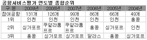이번 수상은 ACI가 지난 2월 16일 2009년 한해동안 분기별로 7개 서비스 분야와 27개 시설·운영분야 등 총 34개 분야에 걸쳐 세계 각국의 공항이용객 25만명을 대상으로 1대 1 직접면접 설문조사에 기초한 평가결과를 바탕으로 한 것이다.