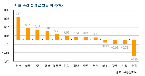 28일 부동산정보업체 부동산114에 따르면 이번주(24~28일) 서울 전세값은 보합세를 보였다. 송파(-0.19%) 노원(-0.05%) 강동(-0.05%) 노원(-0.05%) 성북(-0.03%) 등은 하락했고 용산(0.27%) 성동(0.14%) 중(0.12%) 강북(0.1%) 영등포(0.07%) 관악(0.05%) 등은 소폭 올랐다.
