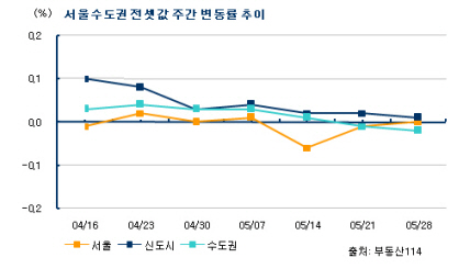 경기·인천은 파주(-0.31%) 양주(-0.2%) 고양(-0.12%) 안산(-0.1%) 의왕(-0.05%) 용인(-0.04%) 남양주(-0.04%) 의정부(-0.03%) 순으로 하락했다. 파주, 고양시는 교하신도시와 신규택지 물량, 가까운 김포한강신도시까지 주변 공급량이 많아 약세가 이어졌다.