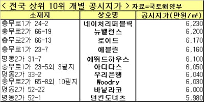 이와 함께 '전국 상위 10위 개별공시지가'를 모두 명동 상권이 싹쓸이 했다.