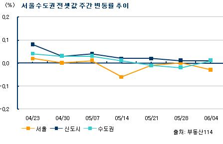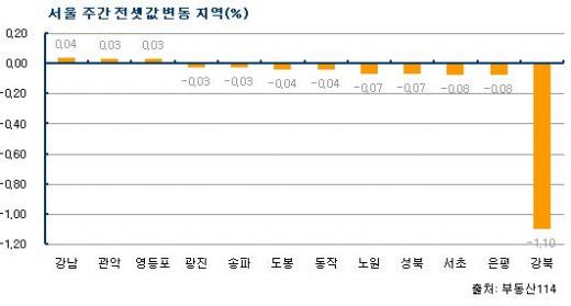 4일 부동산정보업체 부동산114에 따르면 이번주(5월31~6월4일) 서울 전세시장은 강북(-1.10%) 은평(-0.08%) 서초(-0.08%) 성북(-0.07%) 노원(-0.07%) 등이 하락했다. 강남(0.04%) 관악(0.03%) 영등포(0.03%) 등은 소폭 올랐다.