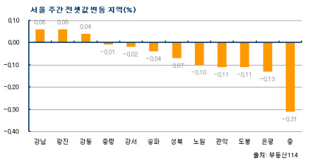 강남구는 대치동 등 주거환경과 교육여건, 학원가 등이 발달한 곳의 소형 아파트 전세값이 오름세를 보이고 있다. 그러나 전반적으로는 약세장이었다. 중(-0.31%) 은평(-0.13%) 도봉(-0.11%) 관악(-0.11%) 노원(-0.1%) 순으로 하락세를 보였다.