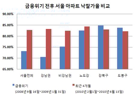 특히 강북구와 도봉구는 금융위기 당시보다 낙찰가율이 더 낮았다. 최근 4개월간 강북구와 도봉구의 낙찰가율은 각각 83.01%, 82.24%로 금융위기 때 보다 1.89%포인트, 1.58%포인트 하락했다. 같은 기간 서울전체(82.79%)와 비강남권(82.44%) 아파트 낙찰가율이 금융위기 때보다 각각 9.61%포인트, 7.24%포인트 높은 것과 대조적이다.