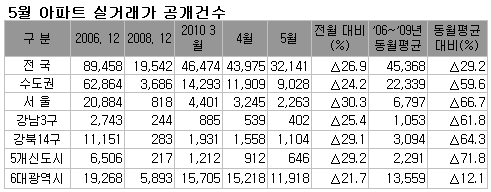15일 국토해양부가 발표한 '5월 신고분 아파트 실거래가 자료'에 따르면 전국 아파트 거래건수는 3만2141건을 기록했다. 이는 전월 거래건수(4만3975건)에 비해 26.9%, 최근 4년간 같은 달 평균 거래량(4만5368건) 대비 29.2%가 각각 감소한 수치다.