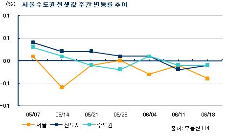 18일 부동산정보업체 부동산114에 따르면 이번주(14~18일) 서울아파트 전세가격이 전주대비 0.04% 하락한데 이어 신도시(-0.01%)와 경기·인천(-0.01%)도 모두 내림세를 기록했다.