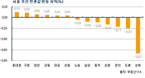 서울에선 성북(-0.67%) 도봉(-0.20%) 관악(-0.17%) 은평(-0.13%) 동작(-0.09%) 송파(-0.08%) 노원(-0.04%)이 하락했다. 성북은 길음동 새 아파트 입주 여파로 래미안·두산위브 등 대단지의 전세 물건 거래가 뜸하다. 길음동·돈암동·하월곡동의 기존아파트 전세 가격도 동반 하락세를 보였다.
