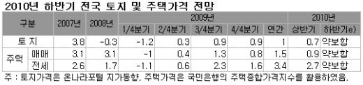 주택가격은 실물경기 회복에도 불구하고 수도권 가격 하락이 확대되면서 전국 부동산 가격을 떨어뜨릴 것으로 예측했다. 다만 금융위기 여파로 가격이 최저수준으로 하락했던 지난해 3월 수준(전저점) 이하로 떨어질 가능성은 낮을 것으로 분석됐다.