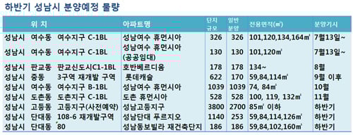 건설업계에 따르면 이달 중 여수지구를 시작으로 도촌과 고등지구 등 경기 성남 일대 택지지구 내 5300여가구의 분양물량이 올 하반기에 쏟아진다. 여수 보금자리주택지구에선 13일부터 101~164㎡(이하 전용면적) 분양주택 326가구와 101~120㎡ 10년 공공임대주택 130가구 등 총 456가구가 분양된다. 분양가는 기준층(3층~최상층) 3.3㎡당 1450만~1500만원 선이다.