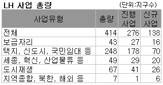 현재 LH는 보금자리주택사업, 택지·신도시, 혁신도시, 도시재생 등 총 414개 사업을 진행하고 있다. 성남시 재개발처럼 손실이 불가피한 사업은 과감히 포기하고 택지개발지구와 신도시, 도시재생 등은 우선순위를 조정해야 하는 상황이다. LH는 내달까지 사업 재조정방안을 확정해 10월 초 나올 재무구조개선방안에 포함시킬 계획이다.