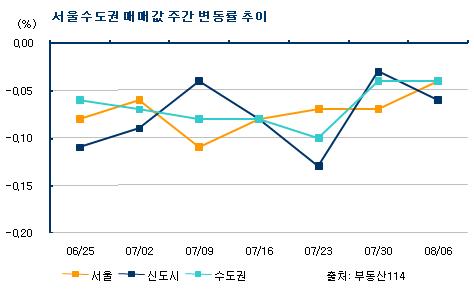 6일 부동산정보업체 부동산114에 따르면 이번주(2~6일) 수도권 아파트 값은 신도시(-0.06%) 서울(-0.04%) 경기·인천(-0.04%) 모두 약보합세를 보였다.