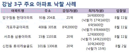 강은 지지옥션 팀장은 "최근 낙찰된 압구정 현대아파트의 경우 응찰자가 1명뿐이었고 은마아파트도 재건축 계획안이 나오는 등 개발호재가 있지만 한파를 비켜가지 못하고 경매에 나오는 실정"이라며 "강남 투자자들이 투자여력을 상실해 발을 빼고 있다"고 말했다.