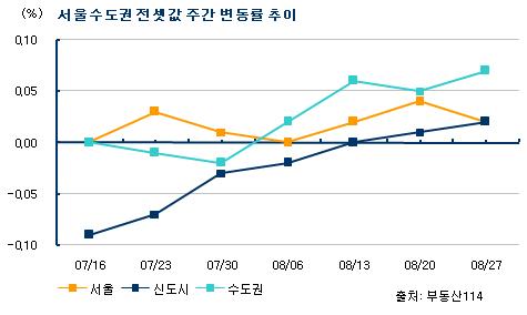 27일 부동산정보업체 부동산114에 따르면 이번주(23~27일) 수도권 전세 가격은 서울(0.02%) 신도시(0.02%) 경기·인천(0.07%) 모두 오름세를 이어갔다. 가격 상승폭이 크지는 않지만 신도시 등을 중심으로 이사철 수요가 늘어났기 때문이다.