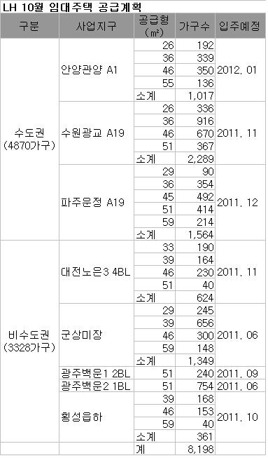 지역별로는 수도권의 경우 안양관양 A1블록 1017가구, 수원광교 A19블록 2289가구, 파주운정 A19블록 1564가구 등 3개 지구에서 4870가구가 공급된다. 지방은 대전 노은3지구 4블록 624가구, 군상미장 1349가구, 광주 백운1지구 2블록 240가구, 광주 백운2지구 1블록 754가구, 횡성읍하 361가구 등 5개 지구 3328가구다.