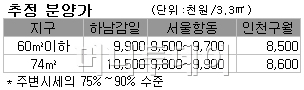 분양주택의 3.3㎡당 추정 분양가는 850만~1050만원으로 주변시세의 75~90% 수준이다. 서울 항동이 60㎡ 이하 950만~970만원 및 74㎡ 980만~990만원, 인천 구월이 60㎡ 이하 850만원 및 74㎡ 860만원, 하남 감일 60㎡ 이하 990만원 및 74㎡ 1050만원 등이다.