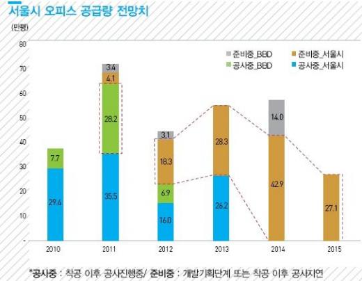 코람코자산신탁은 올해부터 2015년까지 연평균 125만㎡의 오피스가 공급될 것으로 추정했다. 이중 올해 프라임급 오피스만 센터원, 트윈트리, One IFC, 시그니처타워 등 다수에 이른다.