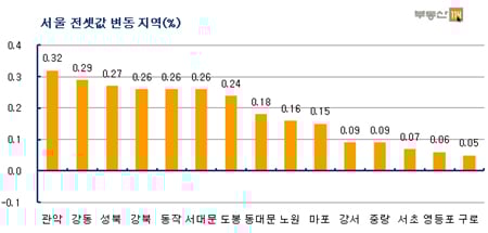 [시황-전세]관악(0.32%) 강동(0.29%) 성북(0.27%) 강북(0.26%) 전셋값 500만원↑
