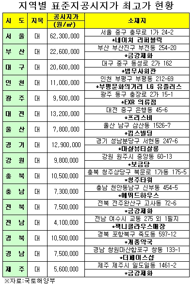 이밖에 ㎡당 표준지 가격이 1000만원을 웃도는 곳은 대전(중구 은행동 45-6 프리스비(애플전문매장), 1320만원)과 충북(청주시 상당구 북문로1가동 175-5 청주타워, 1050만원), 경북(포항시 북구 죽도동 597-12 개풍약국 1050만원) 등 3곳이다.