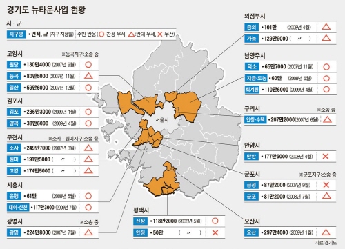 경기도가 뉴타운 사업을 시작한 건 2007년부터. 23개 지구의 완공 목표 시점은 2020년이다. 최근 안양·군포·평택지구 사업이 주민 반대로 무산됐다. 부천·의정부·구리 등 8개 시 12개 지구에서는 주민들이 뉴타운 지정 취소를 요구하는 소송을 냈다.