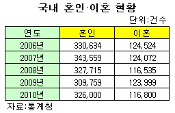 이는 신규(잠재)주택 수요로 파악할 수 있는 혼인·이혼건수에도 못미치는 물량이다. 통계청에 따르면 연간 전국의 혼인건수는 △2006년 33만건 △2007년 34만3000건 △2008년 32만7000건 △2009년 30만9000건 △2010년 32만6000건 등으로 매년 30만쌍 이상 결혼한다. 같은 기간 이혼건수도 연간 11만∼12만건에 달한다.