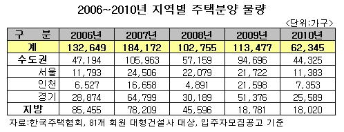 2007년 10만가구 이상 분양이 이뤄진 수도권(서울 포함)에선 지난해 4만4000여가구가 공급되는 데 그쳤다. 지방의 분양실적은 △2007년 7만8000여가구 △2008년 4만5000여가구 △2009년 1만8000가구 △2010년 1만8000여가구로 줄었다.