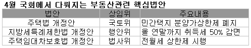 4월 국회에서 3·22 주택거래활성화대책의 핵심인 분양가상한제 폐지 및 취득세율 50% 인하 등과 함께 부작용이 우려되는 전·월세 상한제 등을 다룰 예정이어서 통과여부에 따라 주택시장 정상화가 달렸기 때문이다.