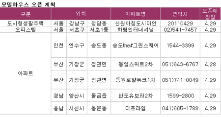29일에는 전국 곳곳에서 신규분양단지의 모델하우스가 문을 연다. 서울의 경우 강남구 청담동 신원아침도시마을 도시형생활주택과 서초구 서초동 하림인터내셔널 오피스텔이 각각 모델하우스를 개관한다. 인천 송도국제도시 '송도 더샵 그린스퀘어' 모델하우스도 같은 날 방문객을 맞이한다.