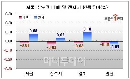 재건축을 포함한 수도권 전체 아파트 매매값도 서울과 인천이 각각 -0.01%씩 떨어졌으며 경기(-0.02%)와 신도시(-0.03%)도 일제히 마이너스 변동률을 기록했다.