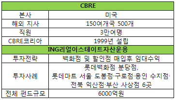 업계 한 관계자는 "ING쪽에서 2년전부터 공실률 상승 우려 때문에 국내 오피스를 팔고 대신 임차인 신용도가 높고 안정적인 임대 수익을 거둘 수 있는 할인점 투자로 대체했다"며 "CBRE도 이런 전략을 유지하면서 인력 충원 등을 통해 투자 대상을 더욱 확대할 방침"이라고 설명했다.