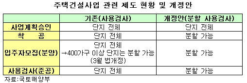 1000가구 이상 주택단지의 경우 3회까지 분할해 착공·사용검사(준공·입주)가 가능하다. 현재는 400가구 이상 단지의 경우 입주자는 분할모집할 수 있지만(3월10일 법개정) 공사와 입주는 일시에 진행해야 한다.