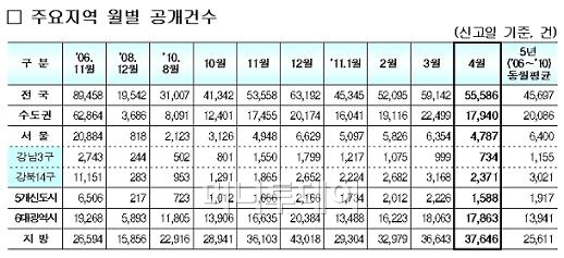 국토해양부가 15일 공개한 '2011년 4월 신고분 아파트 실거래가 자료'에 따르면 이 기간 전국의 아파트 거래건수는 5만5586건으로 전달 5만9142건 대비 6% 줄었다.