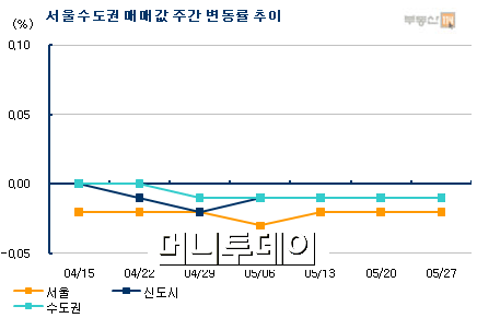 27일 부동산114에 따르면 이번주(5월23~27일) 서울(-0.02%) 신도시(-0.01%) 경기·인천 (-0.01%) 등 수도권 아파트값이 일제히 내림세를 기록했다. 서울은 매수관망세가 짙어지면서 강남권 재건축뿐 아니라 비강남권 일반아파트도 하락세를 나타냈다.