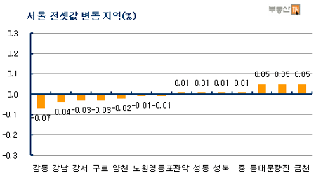 지역별로는 강동(-0.07%) 강남(-0.04%) 강서(-0.03%) 구로(-0.03%) 양천(-0.02%) 등이 하락했다. 강동은 명일동 우성, 명일삼환이 1000만원 내렸다. 학군 수요가 형성되는 강남은 오히려 노후한 아파트 위주로 전세수요가 적어 가격이 떨어졌다. 이주를 준비 중인 청실과 경복아파트도 아직 구체적인 이주 일정이 나오지 않아 문의만 있을 뿐 실제 이동은 6~7월이 돼야 나타날 것으로 예상된다.