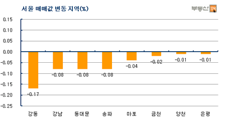 강남(-0.08%) 동대문(-0.08%) 송파(-0.08%) 마포(-0.04%) 금천(-0.02%) 양천(-0.01%) 등이 하락했다. 강남은 주요 재건축단지의 내림폭이 컸다. 대치동 은마 113㎡가 1500만원 내렸고 개포동 주공1,3단지가 1000만원 떨어졌다. 동대문구 이문동 쌍용 등은 중소형 면적이 500만~1000만원 하락했다. 대출 부담 매물 등이 거래를 위해 조정 시도에 나선 것으로 보인다.