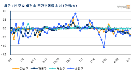 자치구별로는 강동구(-0.17%)가 하락세를 주도했다. 강동구 재건축아파트값은 전주보다 0.41% 떨어졌다. 지난해 7월 초(-0.47%) 이후 가장 큰 폭으로 하락했다. 고덕주공단지가 500만~1000만원, 명일동 삼익그린1차는 500만원 내렸다.