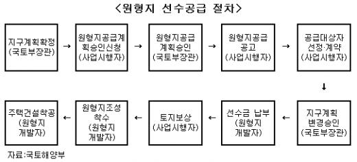 원형지 선수공급은 부지조성공사를 안한 상태의 땅(토지용도는 확정)을 토지보상 전에 사업시행자와 민간건설사 등 협약에 따라 택지공급을 미리 약정하는 것이다.